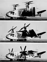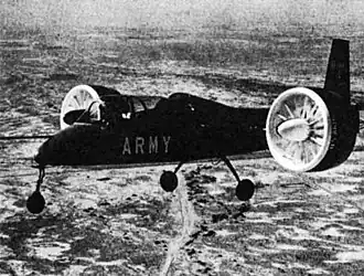 Americký experimentální typ Doak VZ-4 měl také na koncích křídel vrtule umístěné v kovových prstencích. Tyto dvě vrtule byly poháněny jedním turbohřídelovým motorem umístěným v trupu za pilotní kabinou. Výfukové plyny byly odváděny potrubím do zadní části, kde byly vyfukovány ven (řízeně pomocí klapek, toho se využívalo v režimu visu a při přechodu z vertikálního do horizontálního letu a naopak).[10]