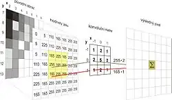 Diskrétní dvourozměrná konvoluce v počítačové grafice. Na původní obraz se aplikuje transformační matice (3×3). Zobrazený způsob představuje korelaci a ne konvoluci, což u středově symetrické transformační matice nemá vliv.