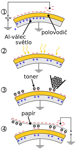 - válcovitý bubínek je elektrostaticky nabitý drátem nebo nábojovým válcem. Buben je potažen fotovodivým materiálem. Fotovodič je polovodič, který se stává vodivým, když je vystaven světlu
