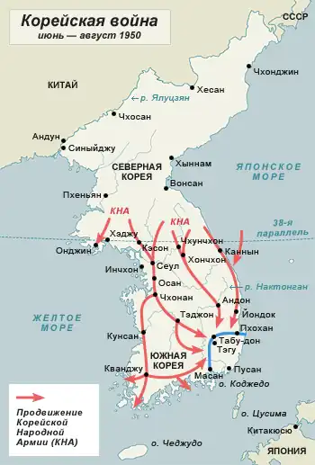 Před rozbřeskem pod dělostřeleckým krytím překročila severokorejská vojska hranici s jižním sousedem s cílem silou opětovně sjednotit obě země pod vedením Strany práce. Pozemní uskupení vojsk podle sovětských vojenských poradců sestávala ze 175 tisíc lidí [9] se 150 tanky Т-34/85 a 172 vojenskými letadly.[10] Na straně Jižní Koreje bylo pozemní vojsko vycvičené americkými specialisty a vyzbrojené americkými zbraněmi čítající na začátku války 93 tisíc osob[9] prakticky bez obrněné techniky a disponovala sotva tuctem lehkých výcvikovo-bojových letounů.[10] Vláda KLDR oznámila, že „zaprodanec“ Li Syn-man věrolomně vpadl na území Severní Koreje. Tažení severokorejské armády bylo v prvních dnech vesměs úspěšné. Již 28. června, po pouhých třech dnech, Severokorejci obsadili jihokorejské hlavní město Soul. Hlavní směry útoku zahrnovaly také Kesong, Čchungčchong, Inčchon a Kjonggi. Soulské letiště Kimpcho bylo zcela zničeno, přesto však nebyl splněn hlavní cíl – blesková válka se nekonala a Li Syn-manovi a významné části jihokorejské reprezentace se podařilo zachránit a opustit město. Všeobecné povstání, na které spoléhalo severokorejské vedení, také nenastalo. Nicméně v půli srpna bylo 90 % území Jižní Koreje obsazeno armádou KLDR.