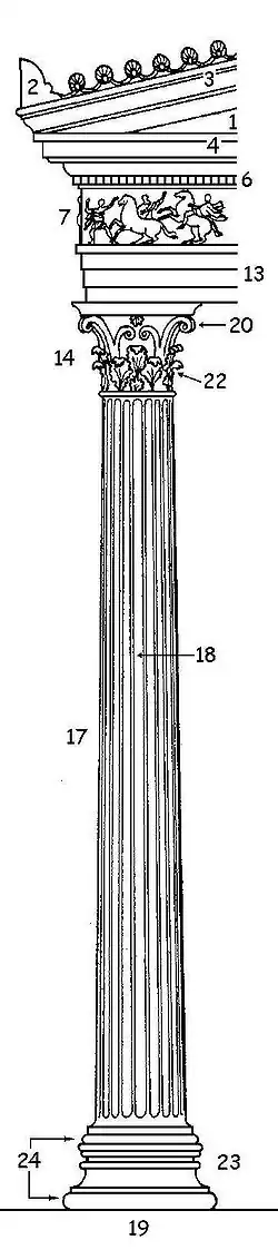 1 – tympanon, 2 – akrotérion, 3 – sima, 4 – římsa, 6 – zubořez 7 – vlys, 13 – třikrát odstupněný architráv, 14 – hlavice, 17 – dřík, 18 – kanelování, 19 – stylobat, 20 – voluta, 22 akant, 23 – patka, 24 – torus