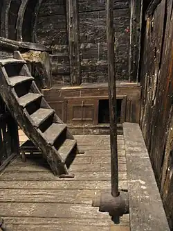 Pohyb tyče na jednu stranu pak byl v opačném směru přenášen na kormidelní páku (která byla podepřena velmi silným trámem, pobitým kovem a pokrytým vrstvou tuku a mýdla, aby bylo minimalizováno tření), a tím vychyloval kormidlo. Mohlo být dosaženo výchylky až 20°,[3] ačkoliv pravděpodobnější se jeví spíše výchylky mezi 5° až 10°.[4]