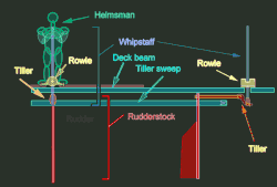Řešením se stala dlouhá tyč, pomocí kloubové objímky spojená s přední částí kormidelní páky, procházející nitrem lodi vzhůru k palubě, k níž byla čepem pohyblivě připojena v takzvané kolébce tak, že mohla být vychylována do stran. Stanoviště kormidelníka stále ještě často nebylo na horní palubě, ale měl možnost výhledu na ni a na oplachtění štěrbinou či průzorem v palubě nad ním.