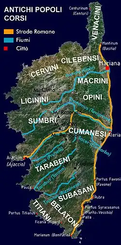 Moderní Korsičané jsou pojmenováni podle starověkého národa, který Latinové nazývali Corsi. Corsiové, kteří dali ostrovu své jméno, ve skutečnosti pocházeli ze severovýchodní části nuragské Sardinie (Gallura). Podle Ptolemaia vytvořily Corsi spojené kmeny, které žily na Korsice (konkrétně Belatoni, Cervini, Cilebenses neboli Cilibensi, Cumanenses neboli Cumanesi, Licinini, Macrini, Opini, Subasani, Sumbri, Tarabeni, Titiani a Venacini)[14] a dále na severovýchodě Sardinie (Lestricones, Lestrigones nebo Lestriconi / Lestrigoni, Longonenses nebo Longonensi). Tito Korsičané sdíleli ostrov s Tibulaty, kteří sídlili na nejzazším severu Sardinie poblíž starověkého města Tibula.