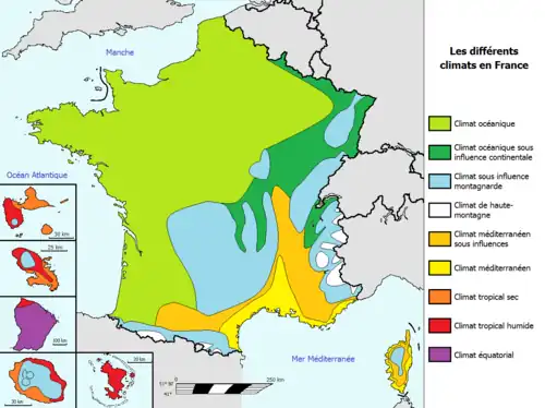Podnebí na Korsice je obecně středomořské, s horkými a suchými léty a mírnými a deštivými zimami na pobřeží a v závislosti na nadmořské výšce s chladnějšími a sněhovými zimami v horách ve vnitrozemí.[43] Středomořské podnebí se vyznačuje trvalým suchem, intenzivním horkem v létě a prudkými bouřemi, které se mohou vyskytovat ve vnitrozemí; zimy jsou mnohem mírnější a vlhčí. V létě se teploty pohybují mezi 25 a 30 °C na pobřeží a někdy jsou vyšší ve vnitrozemí, zatímco v zimě jsou teploty mírnější, obvykle mezi 10 a 15 °C přes den. Ve vyšších nadmořských výškách jsou srážky vydatnější než v nížinách.[44]