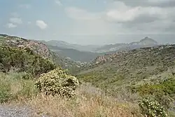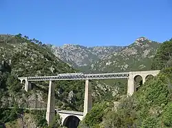 V pohoří jsou vydatné srážky a protíná ho řada průsmyků, které jsou v zimě často zasněžené, zejména průsmyk Vizzavona v nadmořské výšce 1 161 m, kterým prochází hlavní silnice a železnice spojující Ajaccio s Bastií.[35] Ostrov se dělí na dvě jasně odlišené a někdy si konkurující oblasti: Deçà des Monts na severu, která dnes odpovídá Haute-Corse, soustředěné kolem Bastie; Delà des Monts na jihu, která dnes odpovídá Corse-du-Sud, soustředěné kolem Ajaccia.[33] Deçà je do značné míry otevřená italskému poloostrovu, zatímco Delà je mnohem autonomnější.[36] Německý geograf Friedrich Ratzel ji popsal jako „horskou zemi v moři “.[37]