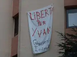 Transparent na Univerzitě Pasquale Paoliho vztyčený stoupenci korsické nezávislosti, vyzývající k propuštění Yvana Colonny