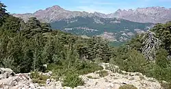 Les borovice černé spp. Laricio pod úbočím svahu u Lac de Nino, Forêt de Valdo-Niellu. Vzadu vlevo Paglia Orba, vpravo masiv Monte Cinto.