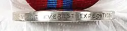Stuha je tmavě červené barvy široká 32 mm (1,25 palce) s pruhy bílé barvy širokými 2 mm lemujícími oba okraje a dvěma úzkými tmavě modrými pruhy širokými 2 mm uprostřed, které leží od sebe ve vzdálenosti 1,6 mm.[4] Dámy mohou medaili nosit poblíž svého levého ramene na stuze uvázané do mašle. Medaile byla udílena bez uvedení jména vyznamenaného s výjimkou 37 medailí určených pro členy britské expedice Edmunda Hillaryho na Mount Everest. Tyto medaile měly na okraji vyryt nápis MOUNT EVEREST EXPEDITION.[1]