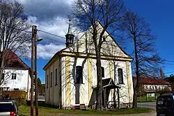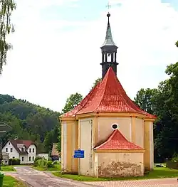 Při kostele stojí výklenková kaple, která je členěná pilastry. V nice kaple se ve štítu nachází zlidovělá soška sv. Jana Nepomuckého. Je zde také pozdně barokní reliéf Kalvárie z konce 18. století.