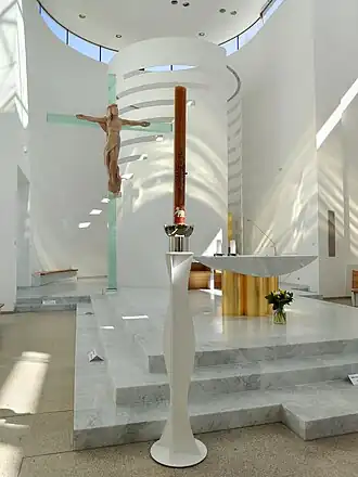 - Skleněný kříž, stojící v levé části presbytáře, vyvažuje excentricky umístěnou kapli Nejsvětější svátosti. Je složen ze tří částí, každá je tvořena 9 vrstvami temperovaného skla, proloženými fóliemi. Středová spojka je z leštěné nerezové oceli a na ní je upevněn korpus Krista Spasitele (olše). Kříž má výšku 5,75 m a hmotnost přes 1 t.[12]