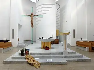 - Adorační kaple Nejsvětější svátosti, která má tvar válce o průměru 5 m a výšce téměř 8 m. Její tvar, tvořený subtilní stěnou s horizontálními otvory, které se šroubovicově vytrácejí směrem nahoru, symbolizuje cestu vzhůru k Bohu.[11]