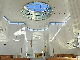 Výrazným prvkem celého interiéru je kruhové stropní okno o průměru 8 m, lemované prstencem z leštěných nerezových plechů zlatého odstínu, které je minimalistickým moderním odkazem na starobylé kopule křesťanských chrámů z prvního tisíciletí. Jeho nezvyklé umělecké a konstrukční řešení též symbolizuje trnovou korunu Krista na kříži. Je jedním ze hlavních zdrojů denního světla i světla symbolického: průhled k obloze přitahuje pohled věřících k nebi, k úběžníku Božího království.[3]