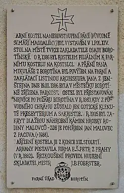 - ↑ a b c d e f g h i CIKHART, Roman. Historický místopis Borotína. I. vyd. Praha: Spolek rodáků a přátel Borotína a okolí v Praze, 1946. 132 s. Kapitola Farní chrám Nanebevstoupení Páně (původně sv. Máří Magdaelny), s. 89. [dále jen Cikhart].