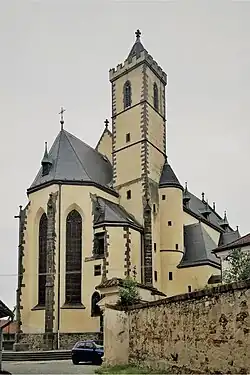 Díky naléhání nových pánů Rožmberských se do města v roce 1360 přistěhoval farář, což vedlo mělo ke změně funkce z kostela filiálního na farní.[2] Jakmile k té změně došlo, nechali bratři z rodu Rožmberků založit farní chrám, který byl vybudován na místě, kde stál starší kostel již v roce 1350.[2] Nový kostel byl dokončen kolem roku 1384. V roce 1604 byla na nároží postavena jihozápadní věž.[2]