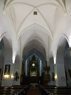 Trojlodí je děleno kamennými hranolovými pilíři nesoucí půlkruhové mezilodní arkády. Křížové klenby hlavní lodi mají štuková žebra a vyrůstají z římsových konzol. Nízké boční lodě mají tři pole křížové klenby a stejná žebra jako v hlavní lodi. Severní boční loď je na západě spojená s čtvercovým polem nedokončené severní věže, která měla symetricky doplňovat věž jižní.