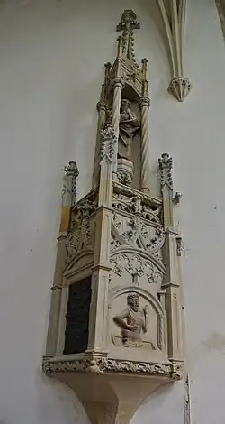 Naproti sanktuáriu je ve zdi kněžiště osazen pískovcový náhrobek Viléma z Ilburka, příbuzného mocného šlechtického rodu Zajíců, který vlastnil místní panství v letech 1438–1490. Je zdoben reliéfem rytíře v brnění s okřídlenou přilbou, mečem v pravici a nápisovou páskou v levici. Horní pás náhrobku je tvořen slepými čtyřlistými kružbami proloženými dvěma erby (na španělských štítech), ilburským a zajícovským.