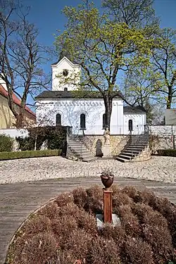 V západní části lodi je tribuna (kruchta). Ta byla s největší pravděpodobností spojena se sousední tvrzí dřevěnou lávkou nebo mostkem, neboť v sousední východní části dnešního zámku jsou zachovány zbytky původní gotické tvrze.[7]
