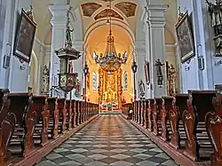 Kněžiště je zaklenuto jedním polem křížové klenby a systémem trojúhelníkových kápí. Trojlodí je obdélníkové. Hlavní loď je zaklenuta třemi čtvercovými křížovými klenbami, boční lodě mají tři obdélníkové křížové klenby. V západní částí se nachází patrová kruchta, která je podklenutá třemi poli křížové klenby. Sakristie je plochostropá. Kaple má strop valený.[2]