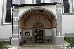 Jižní kamenný portál má románské tvary, což je výraz záměrného historismu a pochází z doby stavby kostela. V oblouku nadpraží se nachází malba Panny Marie Ochranitelky a pochází z téže doby. Malba nad jižními kovanými barokními dveřmi vyobrazuje Madonu v záři na červené středověké omítce z doby kolem 1500.[12]
