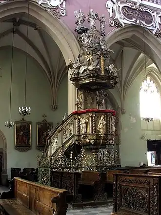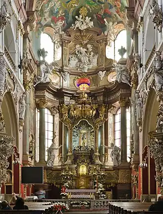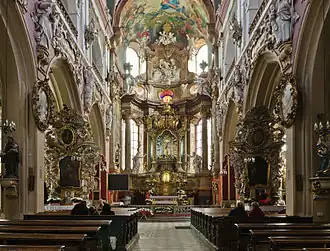 Přestavbu a modernizaci kostela v barokním stylu provedli jezuité, kteří kostel převzali v roce 1624. Tehdy byla položena nová podlaha, přistavěny ochozy, zvýšeny boční lodě, gotické klenby byly vyzdobeny štukem a na místě kaple svaté Anny byla postavena kaple zemřelých.[16] Z té doby také pochází kazatelna a zpovědnice – díla sochaře Michala Klahra. V roce 1723 byl kostel obohacen o nové varhany. V letech 1727–1729 vznikl dnešní hlavní oltář.[17]