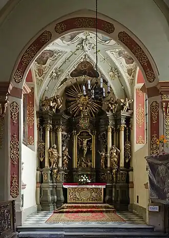 Presbytář je jednou z nejstarších částí kostela, má pozdně barokní interiér z let 1727–1729. Ze stejné doby pochází i hlavní oltář podle návrhu tyrolského architekta a malíře Kryštofa Tausche, s řezbami od sochaře Johanna Albrechta Siegwitze z Bamberka, který jej důmyslně zakomponoval do gotického kněžiště. V oltáři pod baldachýnem je gotická postava „Kladské madony“, z poloviny 15. století, zhotovena z cedrového dřeva a bohatě zdobena symboly evangelistů a plastikami andělů. Nad baldachýnem je atika se sochou Boha Otce v oblacích, nad ním holubice, symbolizující Ducha svatého a nad nimi kříž držený anděly. Oltář lemují dva metry vysoké mramorové sochy svatého Josefa a svatého Jana Křtitele.[22]