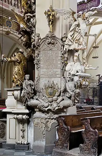 U druhého arkýře severní boční lodi, počítáno od hlavního oltáře, se nachází původní náhrobek zakladatele farního kostela. Byl vyroben na konci 14. století. Tvoří ho tumba z červeného mramoru a na ní se nachází, z bílého vápence, ležící sousoší arcibiskupa.[Pozn. 2][26]