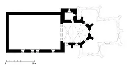 Vzhledem k tomu, že okna bývala na severní straně zvláště ve vyšších zeměpisných polohách z klimatických důvodů redukována nebo zcela vyloučena, nelze za daného stavu poznat a bez dalšího průzkumu stanovit jejich počet a umístění v severní obvodové zdi lodi. Nízký a široce rozepjatý vítězný oblouk se otevíral do kněžiště, které zaujímalo přinejmenším plochu západního pole dnešního presbytáře.