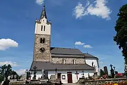 Tento ze širokého okolí viditelný kostel se vypíná na malém návrší na západním okraji vsi. Je obklopen hřbitovem, na nějž se vchází klenutou bránou.
