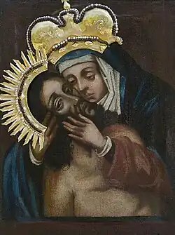 Příběh Panny Marie Přeštické začíná někdy koncem 17. století, kdy si přeštický měšťan Jakub Hoffmeister přinesl z Prahy domů tisk Bratrstva sedmi bolestí Panny Marie s černým škapulířem, na němž byl mj. otištěn i obraz Piety – Matky Boží držící v náručí mrtvé tělo svého syna. Tento obraz měla Hoffmeisterova manželka Alžběta v tak veliké úctě, že si nechala pořídit od dobřanského malíře Matěje Pazourka jeho kopii jako olejomalbu. V roce 1700 při cestě do Říma našla útočiště v domě u manželů Hoffmeisterových poutnice Ludmila Berrová. Při nočních modlitbách před zmíněným obrazem Bolestné Panny Marie zpozorovala na obraze množství krůpějí potu.