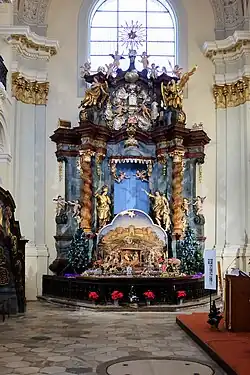 Hlavní oltář zaujímá v hlavní lodi celou čelní stěnu chóru. Nad římsou se klene nástavec s několika putti. Po stranách oltářního plátna stojí sochy svatého Augustina, svaté Heleny, svaté Alžběty Durynské a svatého Karla Boromejského. Po stranách tabernáklu stojí sochy starozákonních kněží Zachariáše a Melschiseda. V autorství samotného oltáře není literatura jednotná. Zmiňován je Eliáš Dollhopf, ale prozatím prameny tento názor nepotvrdily. Rozhodně však Dollhopf hlavní oltář štafíroval. Sloupová architektura a sochy hlavního oltáře jsou dílem sochaře a řezbáře Johanna Karla Stilpa a jeho dvou synů. Datace oltáře 1730–1736 ovšem potvrzuje, že některé sochy byly přivezeny až po umělcově smrti. Umělecky nejhodnotnějším dílem hlavního oltáře je nesignované a nedatované plátno s námětem Nanebevzetí Panny Marie. V německé literatuře je připisováno Dollhopfovi, na základě nových poznatků je obraz dílem Jana Jiřího Heinsche.[6]