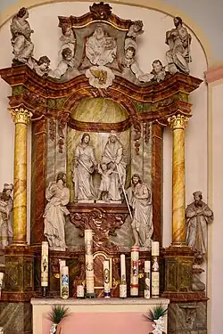 V ambitech je umístěno šest oltářů. Jedná se o oltáře svaté Rodiny, Tří králů, svaté Anežky České, Neposkvrněného početí, Čtrnácti svatých pomocníků a českých zemských patronů (svatý Vojtěch, svatý Jan Nepomucký, svatý Václav, svatá Ludmila a v baroku ojedinělé zobrazení Cyrila a Metoděje). Autorem je sochař a řezbář Jakub Eberle a v součtu se jednalo o přibližně padesát precizně řezaných plastik, z nichž v kompletní podobě se zachovaly dva oltáře, ostatní jen částečně.[6]