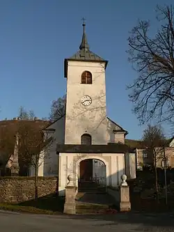 Kostel stojí na hřbitově uprostřed obce, obklopen ohradní zdí z lomového kamene. Před věží, v ose vstupu do kostela, je zeď prolomena nízkou branou s vodorovně zakončenou sedlovou stříškou. Chodníček k předsunutým schůdkům lemují nízké zídky, které jsou ukončeny hranolovými pilířky s kamennými koulemi na vrcholu. U kostela stojí kamenný klasicistní kříž s latinským nápisem s chronogramem 1796.[1]