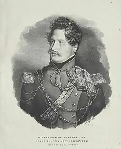 2. hlava křimické linie roudnické primogenitury Lobkowiczů, c. k. komoří (1881),[19] rytmistr v záloze,[19] poslanec Českého zemského sněmu. Majitel velkostatků Křimice a Konopiště, které však v roce 1887 prodal arcivévodovi Františku Ferdinandovi d'Este. | |