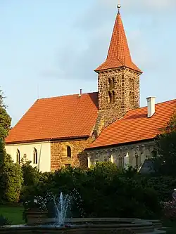 Původní románský kostel byl tvořen obdélníkovou lodí s apsidou na východní straně a hranolovou věží na straně západní. Jako materiál bylo zvoleno tzv. kvádříkové zdivo, pečlivě otesané pískovcové kvádry skládány v nepravidelných řádkách. Kromě samotného kostela byla také postavena románská tvrz, která byla s kostelem propojena můstkem ve výšce prvního patra věže, jež sloužil jako přístupová cesta na tzv. panskou tribunu.