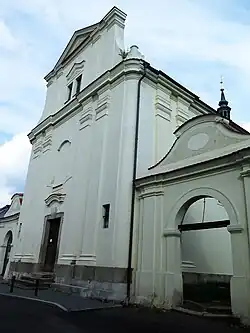 Po stranách hlavního průčelí přiléhají k lodi architektonicky členěné boční branky do kostelního dvora se štíty. K jižní přiléhá původní barokní márnice, později přeměněná na kapli Olivetské hory, nyní prázdná. Za kostelem, k farní ulici se nacházejí fragmenty kamenné městské hradební zdi.
