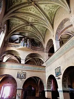 Dvoulodní dispozice chrámu je unikátní svým asymetrickým řešením: v době renesanční byla přistavěna na severní straně empora, která je spojena se zpěváckou tribunou (kruchtou), nad kterou je další klenutá kruchta varhanní. Na jižní straně empora chybí.