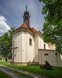 Za presbytářem kostela je studánka. Nově byla upravena ve 20. století. Nad ní je reliéf Pasovské madony, který je polychromovaný, opatřený monogramem WS a letopočtem zřejmě 1703.[2] U kostela stojí socha Panny Marie. V roce 2002 při povodni nad hladinou řeky Labe vyčnívala z vody pouze její poprsí a hlava. Následné povodně již byly o něco nižší, takže socha byla zalita jen částečně.