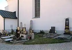 Po zrušení původního hřbitova u farního kostela sv. Vavřince na náměstí v důsledku josefínských reforem, se od začátku 19. století stal kostelem hřbitovním. Takže původní (zazděná) jižní vstupní předsíň (s hřebínkovou křížovou klenbou, jaká se nachází i v sakristii na severní straně kněžiště) se stala márnicí a od konce 19. století zazděná západní vstupní předsíň slouží jako vstup (vřetenovým schodištěm) na dřevěnou varhaní kruchtu.[3] Druhotně proražené stávající hlavní vchody (s dvoukřídlými dveřmi) se proto nachází pod severozápadním a jihozápadním lomeným oknem (severní je hlavní a jižní se již téměř nevyužívá).[4]