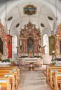 Jednoduchý pozdně barokní kostel s klenutými okny má jednu loď a mírně zapuštěný chór.[1] Věž severně od chóru má osmibokou zvonici, dvě římsy a cibulovou věž s lucernou. Východně od chóru je budova sakristie. V interiéru kostela stropní malby křest Krista, čtyři evangelisté a Nanebevzetí vytvořili malíři Johann Kärle a Stefan Kärle (1879).[2] Kostel má barokní oltář z kostela na Wieselu. Řezby vytvořil Stephan Föger. Varhany postavil Franz Weber (1871) a později byly přestavěny. Zvon je z roku 1700.