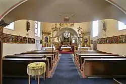 Loď má plochý strop, strop presbytáře tvoří valená klenba s výsečemi.[5] Cínová křtitelnice pochází z první poloviny 17. století. Rokokovou kazatelnu s řadou reliéfů zdobí mimo jiné sošky čtyř evangelistů: Marka, Matouše, Lukáše a Jana.