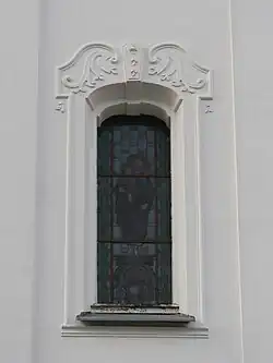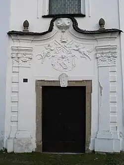 Do kostela se vstupuje portálem v podvěží. Portál rámují podložené pilastry s iónskými hlavicemi nesoucí vypjaté římsové kladí. V supraportě portálu je umístěn reliéfový rodový erb pánů ze Žerotína, nad ním je papežský znak nesený dvojicí letících andílků.[3]