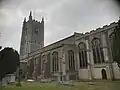Věž má stěny vyložené pazourkovými kvádříky, polygonální rohové rizality, je dělená čtyřmi patrovými římsami a zakončená cimbuřím s rohovými věžičkami. V nejvyšším patře jsou sdružená potrojná pravoúhle zalamovaná okna. V přízemí je průjezd, který má kamennou segmentovou klenbu, na níž jsou tudorovské symboly (růže a Beaufortova mříž), heraldické štíty a iniciály I. W. a T. W. s kupeckou značkou od Johna a Thomase Webbeových.[1][6] Z průjezdu věže vede vchod do kostela. K západnímu průčelí byla v roce 1519 přistavěna 40 m vysoká věž.[7] Ve věži je osm zvonů. Pět z nich bylo ulito před rokem 1552, jeden v roce 1675, další před koncem 17. století a poslední v roce 1717.[3] U kostela je zachován hřbitov se starými náhrobky.