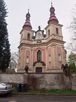 Stojí na místě původní staré hřbitovní kaple[5] z období kolem roku 1500.[4] Byl postaven v letech 1743–1760 a je dílem Jana Kryštofa Kosche. Vzorem byl Koschovi kostel Jana Nepomuckého na Novém Městě v Praze. Věže kostela přibyly ke stavbě až později, a to v roce 1831.[5] Kostel je orientovaný od jihu k severu. Má eliptický presbytář a kruchtu na hlavní ose. V příčné ose se nacházejí dvě pravoúhlé boční kaple. Kostel má dvě průčelní na koso stavěné hranolové věže a dvě sakristie na úhlopříčkách. Věže jsou jednopatrové, členěné pilastry a nikami. Kryté jsou cibulovými báněmi z roku 1831. Hlavní portál je s bohatě plastickou výzdobou. Loď, presbytář a kruchta mají plackovou klenbu na nakupených pilastrech. Boční kaple mají valenou klenbu. V kostele jsou nástropní fresky z roku 1789.[8] Dominantou kostela je pozoruhodná nástropní freska s názvem Tajemství sv. Růžence, jejímž autorem byl malíř Josef Hager. Fresky v lodi na kruchtě zobrazují Zázraky Panny Marie, Narození Panny Marie.[5] V presbytáři pak je ve fresce iluzívní architektura a v celém prostoru postavy čtyř církevních Otců a evangelistů.[8]