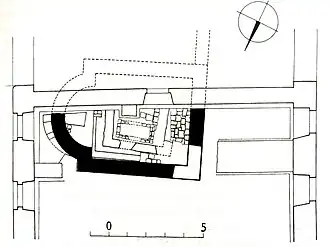 ![]() Kostel Panny Marie, část severní obvodové zdi a segment apsidy s dlažbou | |