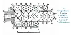 - Čtvercové trojlodí je zaklenuto sítí klínových přetínavých žeber, která jsou uložena na hluboce profilovaných pilířích křížového půdorysu (seskupené do třech trojic ve středu délky trojlodí). Sloupy a žebra tvoří arkády mezi loděmi. Mezi poslední pár pilířů a stěny byla kolem roku 1730 vestavěna barokní zvlněná kruchta s bohatou štukovou výzdobou.