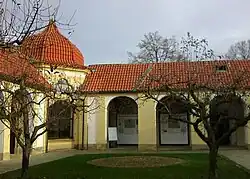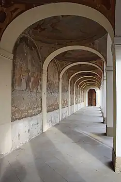 Původně bylo nádvoří kostela ještě osazeno sochami sv. Josefa, sv. Františka Serafínského, sv. Antonína Paduánského, sv. Jana Nepomuckého a pátera Dominika à Jesu Maria, který v bitvě roku 1620 povzbuzoval císařské vojsko. Tyto sochy se do dnešní doby nedochovaly. Ambit byl vymalován v letech 1735–1740 obrazy mariánských poutních míst Čech, Moravy, Slezska, Lužice a Bavorska. Malby jsou připisovány Johannu Adamu Schöpfovi, ale pro silné přemalby nelze jeho autorství prokázat.[zdroj?]