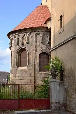 Původní presbytář je tvořen půlkruhovou románskou apsidou o vnějším průměru 8 m, která je zaklenuta románskou žebrovou klenbou. Vnější stěna apsidy je rozdělena čtyřmi lizénami, které vybíhají do obloučkového vlysu neseného rozdílně zdobenými dříky s krychlovými hlavičkami. Stěnu apsidy ukončuje podstřešní římsa se zubořezem. V pětici polí mezi lizénami jsou umístěna oblouková okna. Oknům na jižní a severní straně chybí ostění. Na venkovní zdi v blízkosti apsidy je odhalené pravidelné románské zdivo.[2]