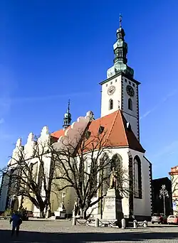 Do náměstí je otočena jižní strana kostela se čtyřmi gotickými okny v presbytáři a čtyřmi v lodi. Na západní a východní straně jsou dva vysoké renesanční obloučkové štíty. Byly vystavěny v roce 1559 patrně při opravě po požáru roku 1532. Dále zde můžeme najít tři menší štíty na severní straně, které byly postaveny také v roce 1559. Menší štíty se nacházejí na jižní straně a byly vytvořeny před rokem 1600. Z krovu nad lodí vystupuje zvonička (sanktusník).