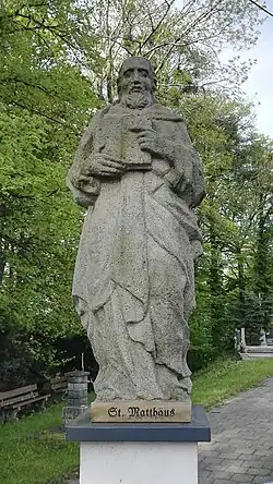 Socha apoštola (sv. Pavel?) – tvoří protějšek plastice sv. Petra. U této však vzhledem k nečitelnosti popisku na soklíku a nejednoznačnosti atributů není jednoznačná identifikace apoštola. Jiné zdroje uvádějí, že jde o sochy světců Matouše a Filipa.[8]
